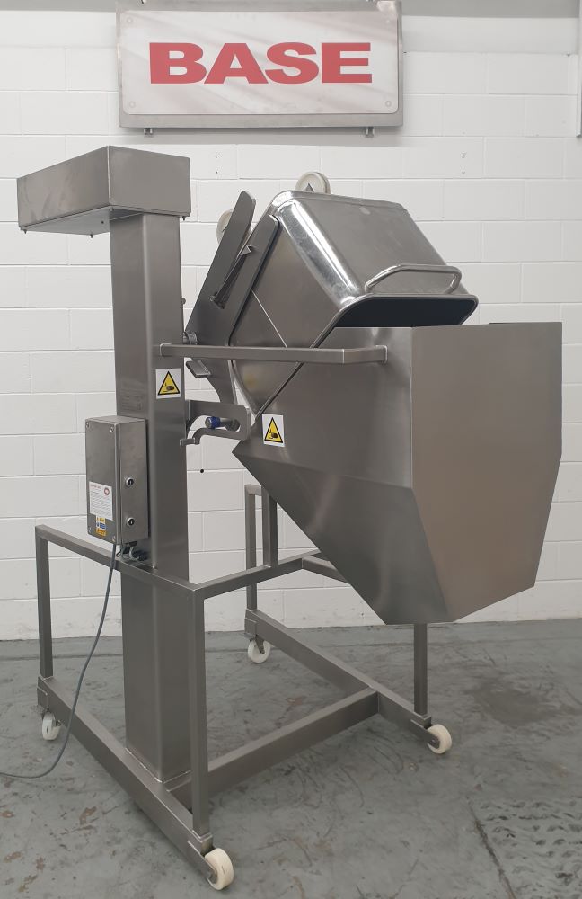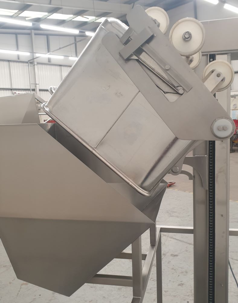 BTM/300/1350/M Dump Buggy Lifter Tipper The Dump Buggy Lifter Tipper was designed to lift and tip a 200 Litre Dump Buggy at a discharge height of 1350mm into an intermediate chute. The Dump Buggy Lifter Tipper was manufactured from Grade 304 stainless steel, is a welded construction throughout and is designed to be mobile on castors. The lifting is achieved by a ¾” Simplex chain driven by a motor gearbox mounted at the top of the main column. The unguarded machine is fitted with our unique safety latch which engages automatically in the extremely unlikely event of a lift chain failure. Dump Buggy Lifter Tipper Electrical Control The Dump Buggy Lifter Tipper was fitted with an IP65 Stainless Steel Control Panel mounted on the main column at a convenient position to give good maintenance access under the Provision and Use of Work Equipment Regulation 1998 (PUWER). Upper and Lower end of travel limit switches are positioned to prevent inadvertent adjustment or damage but are easily adjustable by trained personnel for fine adjustment on site. The unguarded Dump Buggy Lifter Tipper operates on a ‘hold to run’ principle such that the ‘Up’ or ‘Down’ pushbuttons must be held for the Dump Buggy Lifter Tipper to operate. As soon as either button is released, the Dump Buggy Lifter Tipper will stop. The control panel has a volt free pair of contacts which can be used to connect a ‘Call to Run’ signal if required.