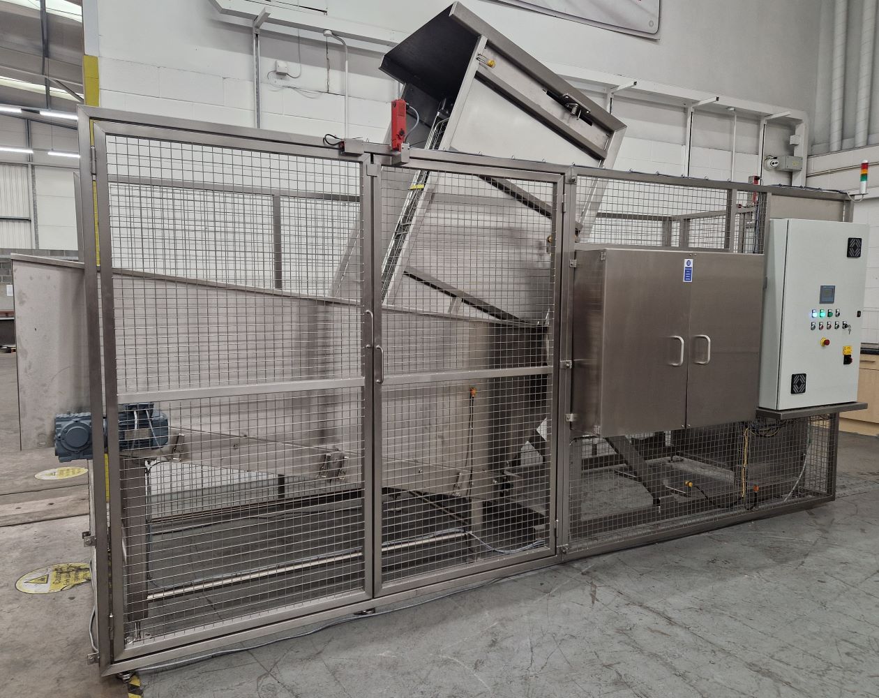 BTM/400/1000/B/G Roll Cage TipperThis Roll Cage Tipper was designed to lift and tip a Postal Container and a Euro Pallet Box at a discharge height of 1000mm. The Roll Cage Tipper is a fully welded steel construction and is designed to be bolted to the floor. This Roll Cage Tipper is powered via a Helical Bevel gearbox and would tip the Roll Cage or Pallet Box to an angle of 160 degrees. The Roll Cage or Pallet Box would be loaded into lift frame and raised by rotation of the lifting carriage by the motor gearbox. As the Roll Cage is tipped over to the full tip angle the mail and parcels are discharged into the conveyor hopper. The Roll Cage and Pallet Box were securely retained in the lift carriage in the fully tipped position. Safety Guard to BS EN 14120:2015 Safety of MachineryThe Roll Cage Tipper was supplied complete with a safety guard to meet the guidelines of BS EN 14120:2015 Safety of Machinery Guards. The safety guard is constructed from 40 x 40 x 3mm stainless steel box section and 3mm wire, 40mm aperture weld mesh. It encloses the Roll Cage Tipper to a height of 2200mm on two sides, 1000mm at the tipping side with a pair of interlocked hinged guard doors on the fourth side. The guard doors are electrically and mechanically interlocked to prevent the Roll Cage Tipper from operating if either door is open. Additionally, the guard doors can only be opened when the lift carriage is at the full down position to prevent access whilst a load is raised. Roll Cage Tipper Electrical ControlThe Roll Cage Tipper is fitted with an IP65 Control Panel which is mounted on the safety guard and incorporates all of the controls for the Roll Cage Tipper and the Conveyor. The Roll Cage Tipper Control included an Inverter to allow for speed control and it used a Rotary Position Sensor to stop at the full up and full down positions. It also used Over Travel Proximity Sensors which were independent of the Rotary Sensor. The Control Panel is fitted with a PLC and HMI that allows features including:-- Adjustment of the Full Up position