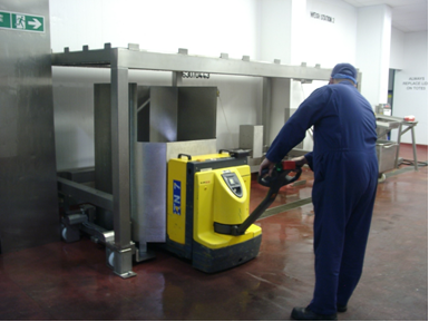 The main ingredient in most recipes is frozen vegetables which are supplied in 1000 Kgs cardboard Octoboxes. These boxes are loaded directly into Double Pillar Tippers using a powered hand pallet truck and tipped into the cooking vessel. The design of the tipper and its interface with the cooking vessel are such that 100% of the products are delivered into the vessels with no spillage.