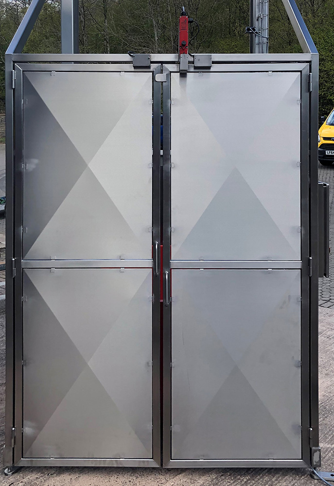 BTM/2P/600/1800/B/G Double Pillar Dolaf TipperThis Double Pillar Dolaf Tipper was designed to lift and tip a 600 Kgs Dolaf Container (1200mm L x 1000mm W x 780mm H) at a discharge height of ¬1800mm. The Double Pillar Dolaf Tipper is manufactured from Grade 304 stainless steel, is a welded construction throughout and is designed to be bolted to the floor. The lifting is accomplished via chains driven by a motor gearbox mounted at the top of the one column with a crossover shaft to the other column. Safety Guard to BS EN 14120:2015 Safety of Machinery GuardsThis Double Pillar Dolaf Tipper was supplied complete with a safety guard to meet the guidelines of BS EN 14120:2015 Safety of Machinery Guards. The safety guard is constructed from 40 x 40 x 3mm stainless steel box section and 2.0mm stainless steel sheet. It encloses the Double Pillar Dolaf Tipper to a height of 2200mm on two sides, 1650mm at the tipping position with a pair of hinged guard doors on the fourth side. The guard doors are electrically and mechanically interlocked preventing the Double Pillar Dolaf Tipper from operating when the door is open. Additionally, the guard doors can only be opened when the lift carriage is at the full down position to prevent access whilst a load is raised. Double Pillar Dolaf Tipper Electrical ControlThis Double Pillar Dolaf Tipper is fitted with an IP65 Stainless Steel Control Panel which is mounted on the Safety Guard at a convenient position to give good maintenance access under the Provision and Use of Work Equipment Regulation 1998 (PUWER). The control panel incorporates the following controls; Up, Down, Guard Release, Emergency Stop and a Reset Facility. Upper and Lower end of travel limit switches are positioned to prevent inadvertent adjustment or damage but are easily adjustable by trained personnel for fine adjustment on site. The guarded Double Pillar Dolaf Tipper operation is latched so that pressing the ‘Up’ push button once will raise the lift to the full tip position. Once the product has been discharged, pressing the ‘Down’ push button once will return the Double Pillar Dolaf Tipper to the full down position. The control panel has a volt free pair of contacts which can be used to connect a ‘Call to Run’ signal if required.