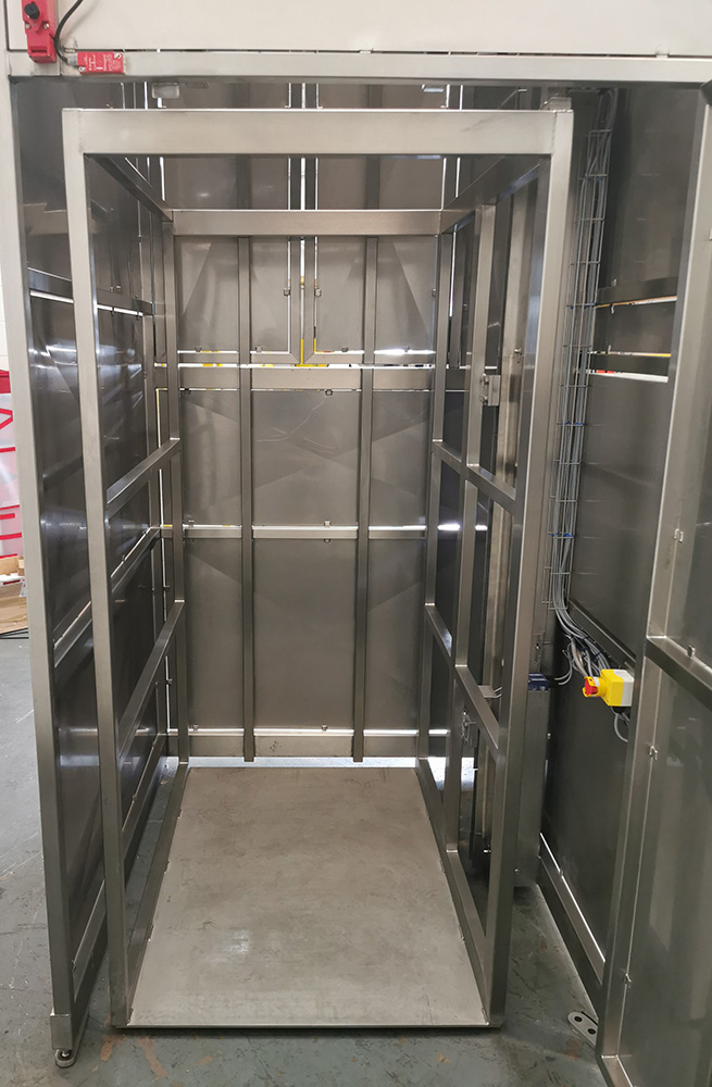 The safety guard is constructed from 40 x 40 x 3mm stainless steel box section and 2mm stainless steel sheet to meet the requirements of BS EN 14120:2015 Safety of Machinery Guards. This guard will reach to a height of 2200mm above the mezzanine floor level, having a hinged doors at each level through which the Stainless Steel Platform Lift can be loaded and unloaded. All doors are electrically interlocked to prevent the Stainless Steel Platform Lift being operated with any door open and in addition, the doors are mechanically locked closed whilst the Stainless Steel Platform Lift is running. Each door may only be opened when the lifting carriage is at the appropriate level.