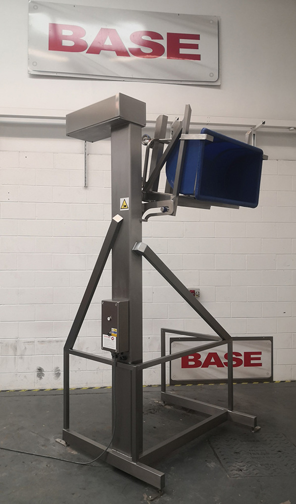 BTM/300/2200/B Single Pillar Trolley TipperThis Single Pillar Trolley Tipper is designed to lift and tip a Blue Plastic Trough on a Trolley at a discharge height of 2200mm. The Trolley Tipper is manufactured from Grade 304 stainless steel, is a welded construction throughout and is designed to be bolted to the floor. The lifting is achieved by a ¾” Simplex chain driven by a motor gearbox mounted at the top of the main column. The unguarded Trolley Tipper is fitted with our unique safety latch which engages automatically in the extremely unlikely event of a lift chain failure. Trolley Tipper Electrical ControlThis Trolley Tipper is fitted with an IP65 Stainless Steel Control Panel which is mounted on the main column at a convenient position to give good maintenance access under the Provision and Use of Work Equipment Regulation 1998 (PUWER). Upper and Lower end of travel limit switches are positioned to prevent inadvertent adjustment or damage but are easily adjustable by trained personnel for fine adjustment on site. The unguarded Trolley Tipper operates on a ‘hold to run’ principle such that the ‘Up’ or ‘Down’ pushbuttons must be held for the Trolley Tipper to operate. As soon as either button is released, the Trolley Tipper will stop. The control panel has a volt free pair of contacts which can be used to connect a ‘Call to Run’ signal if required.