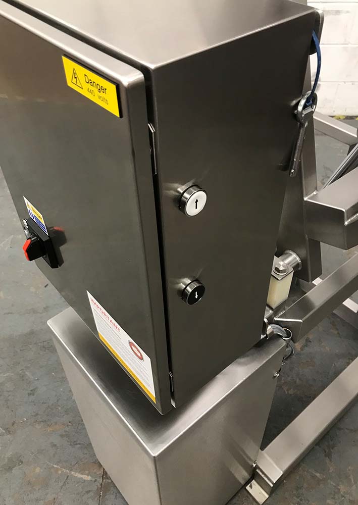 BTH/250/1000/B Hydraulic 120 Litre Wheelie Bin DumperThis 120 Litre Wheelie Bin Dumper is designed to lift and tip a standard 120 Litre Wheelie Bin at a discharge height of 1000mm and had a Safe Working Load of 250 Kgs. The Wheelie Bin Dumper is constructed from stainless steel and was designed to be bolted to the floor or welded to the deck if preferred. This Wheelie Bin Dumper is powered via a hydraulic powerpack and tips the containers by the extension of a hydraulic cylinder to an angle of 30 degrees past the horizontal. The hydraulic cylinder is fitted with a safety check valve such that even in the unlikely event of a hydraulic hose failure, the raised bin will not fall to the floor. 120 Litre Wheelie Bin Dumper Electrical ControlThis 120 Litre Wheelie Bin Dumper was fitted with an IP65 Control Panel mounted on the main frame at a convenient position to give good maintenance access under the Provision and Use of Work Equipment Regulation 1998 (PUWER). The unguarded 120 Litre Wheelie Bin Dumper operates on a ‘hold to run’ principle such that the ‘Up’ or ‘Down’ pushbuttons must be held for the Tipper to operate. As soon as either button is released, the Tipper will stop. The control panel has a volt free pair of contacts which can be used to connect a ‘Call to Run’ signal if required.