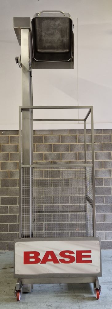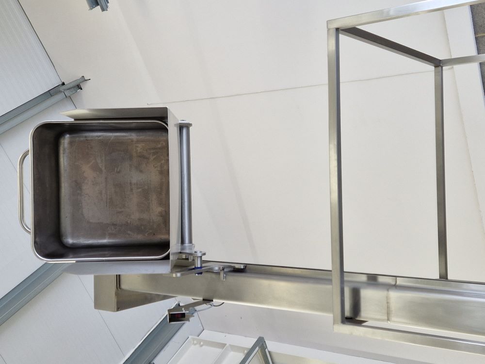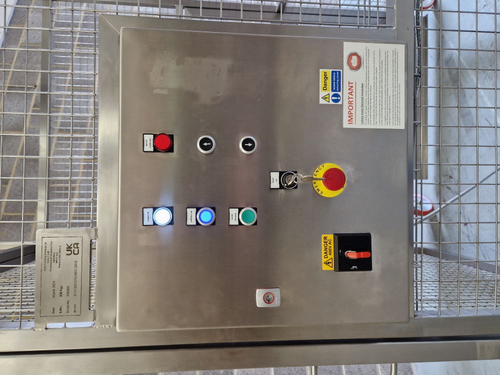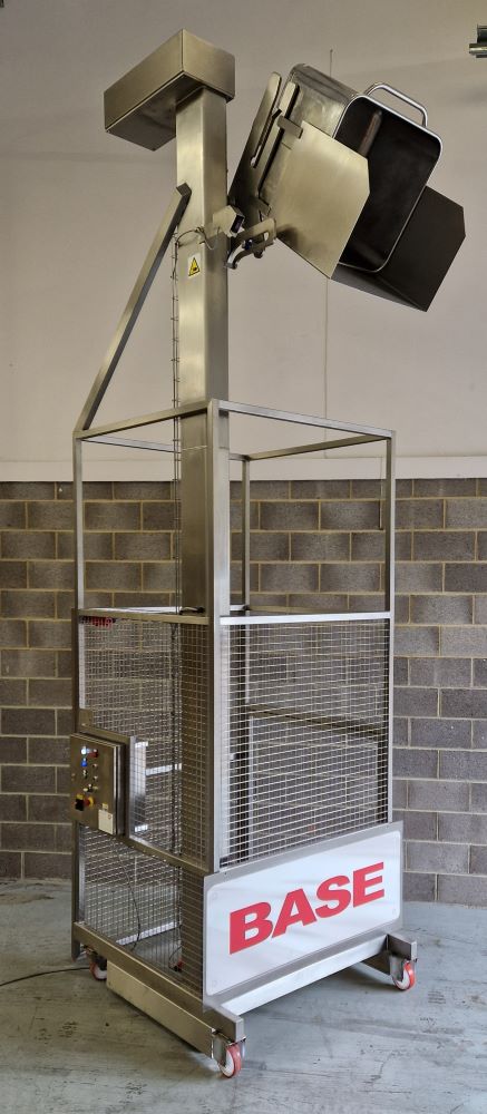 BTM/300/3700/M/G RORO Skip LoaderThis RORO Skip Loader was a single pillar tote bin tipper that was designed to lift and tip at a discharge height of 3700mm. The machine was manufactured from Grade 304 stainless steel and is a welded construction throughout. The RORO Skip Loader was mobile on castors to allow it to load waste along the full length of the Waste Skip. The lifting is achieved by a ¾” Simplex chain driven by a motor gearbox mounted at the top of the main column. Safety Guard to BS EN 14120:2015 Safety of Machinery GuardsThe RORO Skip Loader was supplied complete with a safety guard to meet the guidelines of BS EN 14120:2015 Safety of Machinery Guards. The safety guard is constructed from 40 x 40 x 3mm stainless steel box section and 40 x 40 x 3mm wire, mesh. It encloses the RORO Skip Loader to a height of 2200mm on three sides with a hinged guard door on the fourth side. The guard door is electrically and mechanically interlocked preventing the machine from operating when the door is open. Additionally, the guard door can only be opened when the lift carriage is at the full down position to prevent access whilst a load is raised. RORO Skip Loader Electrical ControlThis RORO Skip Loader is fitted with an IP65 Stainless Steel Control Panel mounted on the safety guard at a convenient position to give good maintenance access under the Provision and Use of Work Equipment Regulation 1998 (PUWER). Upper and Lower end of travel limit switches are positioned to prevent inadvertent adjustment or damage but are easily adjustable by trained personnel for fine adjustment on site. The control panel incorporates the following controls; Up, Down, Guard Release, Emergency Stop and a Reset Facility. The RORO Skip Loader operation is latched so that pressing the ‘Up’ push button once will raise the lift to the full tip position. Once the product has been discharged, pressing the ‘Down’ push button once will return the RORO Skip Loader to the full down position. The control panel has a volt free pair of contacts which can be used to connect a ‘Call to Run’ signal if required.