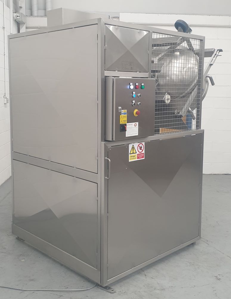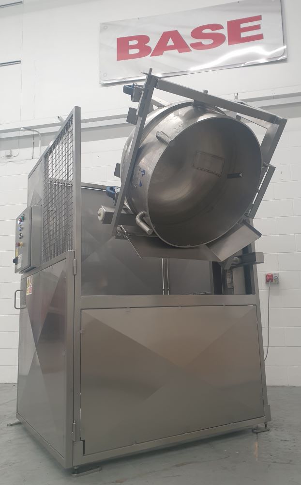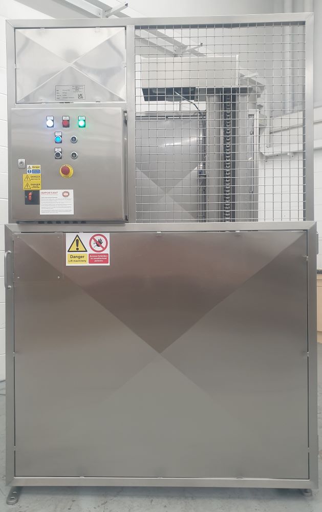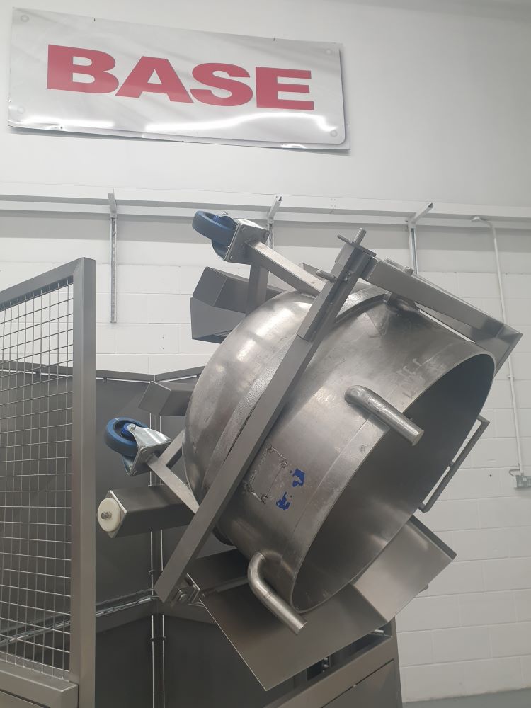 BTM/300/1100/B/G/SL Guarded Mixing Bowl TipperThis Guarded Mixing Bowl Tipper was designed to lift and tip an 850mm diameter mixing bowl at a discharge height of 1100mm. The mixing bowl was loaded by being wheeled onto a pair of lifting forks that lifted the bowl clear of the floor. Prior to lifting, an electrically interlocked clamp gate must be closed and clamped to prevent the bowl from moving and the bowl was also securely retained in the tipped position. The Guarded Mixing Bowl Tipper was manufactured from Grade 304 stainless steel, is a welded construction throughout and is designed to be bolted to the floor. The lifting is achieved by a ¾” Duplex chain driven by a motor gearbox mounted at the top of the main column. Safety Guard to BS EN 14120:2015 Safety of Machinery GuardsThe Guarded Mixing Bowl Tipper was supplied complete with a safety guard to meet the guidelines of BS EN 14120:2015 Safety of Machinery Guards. The safety guard is constructed from 40 x 40 x 3mm stainless steel box section and 2.0mm stainless steel sheet. It encloses the machine to a height of 2200mm on two sides, 1000mm at the tipping position with a hinged guard door at the loading position. The guard door is electrically and mechanically interlocked preventing the Guarded Mixing Bowl Tipper from operating when the door is open. Additionally, the guard door can only be opened when the lift carriage is at the full down position to prevent access whilst a load is raised. Guarded Mixing Bowl Tipper Electrical ControlThe Guarded Mixing Bowl Tipper was fitted with an IP65 Stainless Steel Control Panel mounted on the main column at a convenient position to give good maintenance access under the Provision and Use of Work Equipment Regulation 1998 (PUWER). Upper and Lower end of travel limit switches are positioned to prevent inadvertent adjustment or damage but are easily adjustable by trained personnel for fine adjustment on site. The control panel incorporates the following controls; Up, Down, Guard Release, Emergency Stop and a Reset Facility. The Guarded Mixing Bowl Tipper operation is on a hold to run basis so that holding the ‘Up’ push button will raise the lift to the full tip position. Once the product has been discharged, holding the ‘Down’ push button once will return the Guarded Mixing Bowl Tipper to the full down position. The control panel has a volt free pair of contacts which can be used to connect a ‘Call to Run’ signal if required.