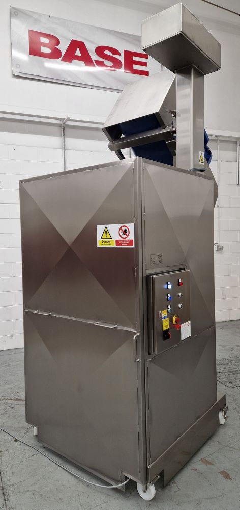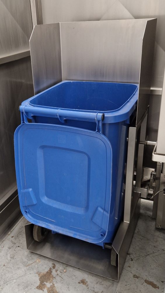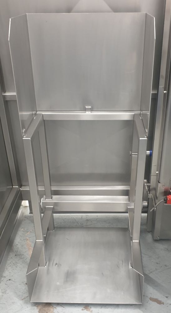BTM/300/2100/M/G Incinerator Wheelie Bin TipperThis Incinerator Wheelie Bin Tipper was designed to lift and tip a 240 Litre Wheelie Bin at a discharge height of 2100mm to load an Incinerator. The Incinerator Wheelie Bin Tipper was manufactured from Grade 304 stainless steel, is a welded construction throughout and is designed to be bolted to the floor. The lifting is achieved by a ¾” Simplex chain driven by a motor gearbox mounted at the top of the main column. Safety Guard to BS EN 14120:2015 Safety of Machinery GuardsThe Incinerator Wheelie Bin Tipper was supplied complete with a safety guard to meet the guidelines of BS EN 14120:2015 Safety of Machinery Guards. The safety guard is constructed from 40 x 40 x 3mm stainless steel box section and 2.0mm stainless steel sheet. It encloses the Incinerator Wheelie Bin Tipper to a height of 2200mm on two sides, 2000mm on the tipping side with a hinged guard door on the fourth side. The guard door is electrically and mechanically interlocked preventing the Incinerator Wheelie Bin Tipper from operating when the door is open. Additionally, the guard door can only be opened when the lift carriage is at the full down position to prevent access whilst a load is raised. Incinerator Wheelie Bin Tipper Electrical ControlThe Incinerator Wheelie Bin Tipper was fitted with an IP65 Stainless Steel Control Panel which is mounted on the main column at a convenient position to give good maintenance access under the Provision and Use of Work Equipment Regulation 1998 (PUWER). Upper and Lower end of travel limit switches are positioned to prevent inadvertent adjustment or damage but are easily adjustable by trained personnel for fine adjustment on site. The control panel incorporates the following controls; Up, Down, Guard Release, Emergency Stop and a Reset Facility. The Incinerator Wheelie Bin Tipper operation is latched so that pressing the ‘Up’ push button once will raise the lift to the full tip position. Once the product has been discharged, pressing the ‘Down’ push button once will return the Incinerator Wheelie Bin Tipper to the full down position. The control panel has a volt free pair of contacts which can be used to connect a ‘Call to Run’ signal if required.