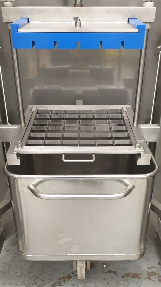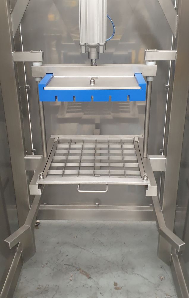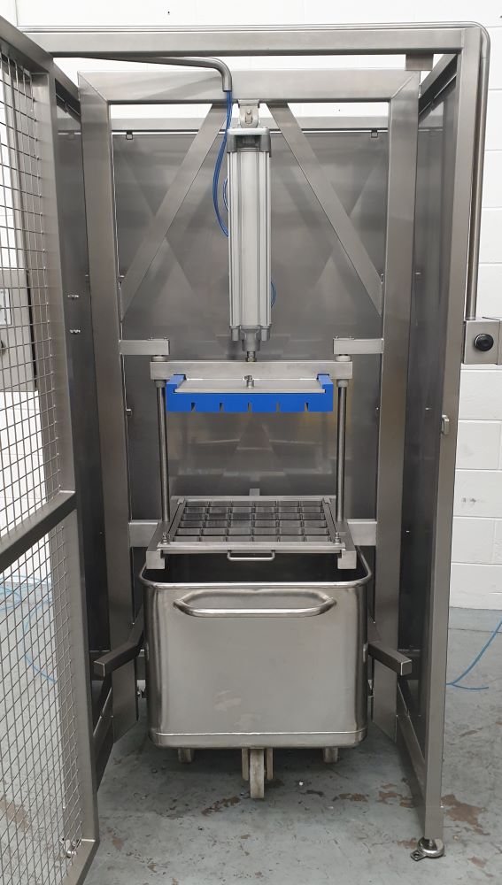 This Butter Block Cutter is designed to cut tempered blocks of butter into 75 x 75mm segments. To cut the butter into individual blocks they can be turned through 90 degrees and placed back onto the cutting frame for a second cut. The Butter Block Cutter is manufactured from Grade 304 Stainless Steel throughout and the cutting operation is via a guided pneumatic cylinder and pusher plate. When the cylinder extends it presses the butter through the cutting blades and into a mixing bowl placed underneath.