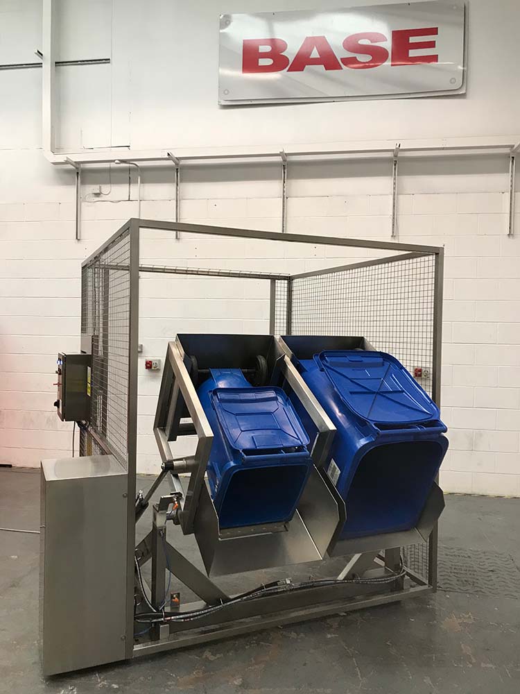 BTH/500/500/B/G Hydraulic 120 & Hydraulic Wheelie Bin TipperThe Hydraulic Wheelie Bin Tipper was designed to lift and tip 2 off 240 Litre Wheelie Bins or 2 off 120 Litre Wheelie Bins at a height of 500mm at the edge of a Loading Bay directly into a skip and had a Safe Working Load of 500 Kgs. The Hydraulic Wheelie Bin Tipper was constructed from Grade 304 stainless steel, was a fully welded construction throughout and was designed to be bolted to the floor. This Hydraulic Wheelie Bin Tipper was powered via a hydraulic powerpack and tipped the Wheelie Bins by the extension of a hydraulic cylinder to an angle of 30 degrees past the horizontal. The hydraulic cylinder was fitted with a safety check valve such that even in the unlikely event of a hydraulic hose failure, the raised bins will not fall to the floor. Safety Guard to BS EN 14120:2015 Safety of Machinery GuardsThe Hydraulic Wheelie Bin Tipper was supplied complete with a safety guard to meet the guidelines of BS EN 14120:2015 Safety of Machinery Guards. The safety guard was constructed from 40 x 40 x 3mm stainless steel box section and 40 x 40mm aperture, 3mm wire stainless steel weld mesh and enclosed the machine to a height of 2200mm on two sides. The loading and unloading position is guarded using a Safety Light Barrier. Hydraulic Wheelie Bin Tipper Electrical ControlThe Hydraulic Wheelie Bin Tipper was fitted with an IP65 Stainless Steel Control Panel which was mounted on the main frame at a convenient position to give good maintenance access under the Provision and Use of Work Equipment Regulation 1998 (PUWER). Upper and Lower end of travel limit switches are positioned to prevent inadvertent adjustment or damage but are easily adjustable by trained personnel for fine adjustment on site. The control panel incorporates the following controls; Control On, Auto Tip Cycle Start, Emergency Stop and a Reset Facility. The Hydraulic Wheelie Bin Tipper operation is based on an automated tip cycle such that once 2 off bins are loaded and the tip cycle is initiated, the machine will travel to the full up position, pause while the bins discharge and then return to the full down position. If the Safety Light Barrier is broken at any time, the machine will stop.