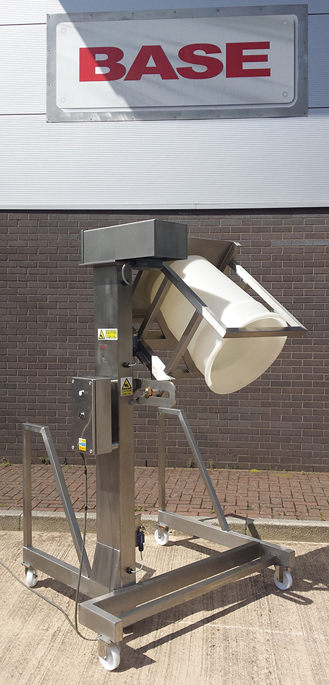 BTM/250/1275/M Single Pillar Drum Hoist This Mobile Single Pillar Drum Hoist is designed to lift and tip at a discharge height of 1275mm. The Drum Hoist is manufactured from Grade 304 stainless steel and is a welded construction throughout. The lifting is achieved by a ¾” Simplex chain driven by a motor gearbox mounted at the top of the main column. The Drum Hoist is fitted with our unique safety latch which engages automatically in the extremely unlikely event of a lift chain failure. To avoid spillage as your drums are being tipped, we feel that there should be a conical intermittent infeed cone which will locate into the Sieve Inlet and allow the ingredients to pass through without spillage. Drum Hoist Electrical Control This Drum Hoist is fitted with an IP65 Stainless Steel Control Panel which is mounted on the main column at a convenient position to give good maintenance access under the Provision and Use of Work Equipment Regulation 1998 (PUWER). The Drum Hoist has ‘dead man’s handle’ control such that the ‘Up’ or ‘Down’ pushbuttons must be held for the Drum Hoist to operate. As soon as the button is released, the Drum Hoist will stop. The control panel has the facility for a ‘Call to Run’ signal to be connected if required.