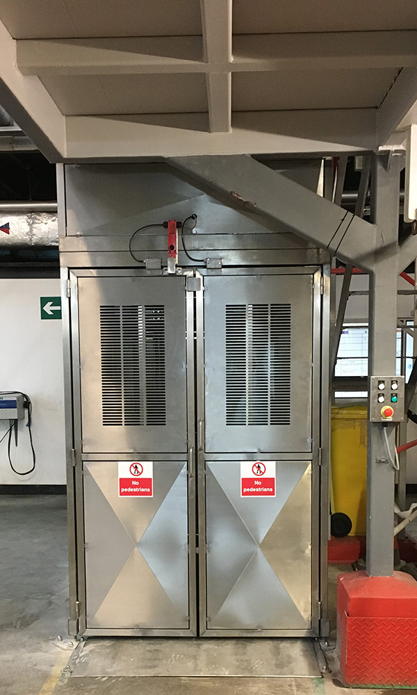 To suit the plant layout, the pallets were loaded and unloaded from the same side of the lift at the lower and upper levels. To fit within the space available at the end of the mezzanine floor, the main columns of the Between Floor Lift were mounted at the rear of the between floor lift on the opposite side to the loading doors. The Between Floor Lift was made in two sections which were assembled on site during installation. There was ramp fitted at the ground floor and a landing plate and ramp on the mezzanine floor level.
