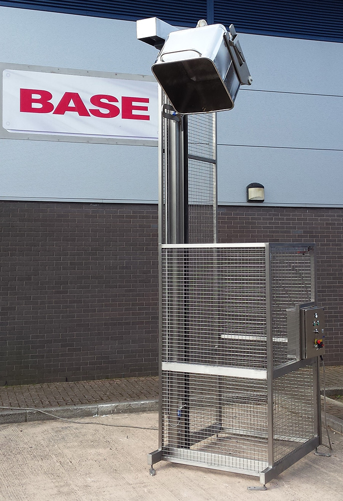 BTM/250/3700/B/G Single Pillar Column Lifter Guarded This Column Lifter Guarded is a single pillar 200 Litre tote bin tipper that is designed to lift and tip at a discharge height of 3700mm. The Column Lifter Guarded is manufactured from Grade 304 stainless steel, is a welded construction throughout and is designed to be bolted to the floor. The lifting is achieved by a ¾” Simplex chain driven by a motor gearbox mounted at the top of the main column. Safety Guard to BS EN 14120:2015 Safety of Machinery Guards The safety guard is constructed from 40 x 40 x 3mm stainless steel box section and 3mm wire, 40mm aperture stainless steel weld mesh to meet the guidelines of BS EN 14120:2015 Safety of Machinery Guards. It encloses the Column Lifter Guarded to a height of 2200mm on three sides, with a hinged guard door on the fourth side. The guard door is electrically and mechanically interlocked preventing the Column Lifter Guarded from operating when the door is open. Additionally, the guard door can only be opened when the lift carriage is at the full down position to prevent access whilst a load is raised. Column Lifter Guarded Electrical Control This Column Lifter Guarded is fitted with an IP65 Stainless Steel Control Panel which is mounted on the safety guard at a convenient position to give good maintenance access under the Provision and Use of Work Equipment Regulation 1998 (PUWER). The control panel incorporates the following controls; Up, Down, Guard Release, Emergency Stop and a Reset Facility. The Column Lifter Guarded operation is latched so that pressing the ‘Up’ push button once will raise the lift to the full tip position. Once the product has been discharged, pressing the ‘Down’ push button once will return the Column Lifter Guarded to the full down position. The control panel has the facility for a ‘call to run’ signal to be connected if required.