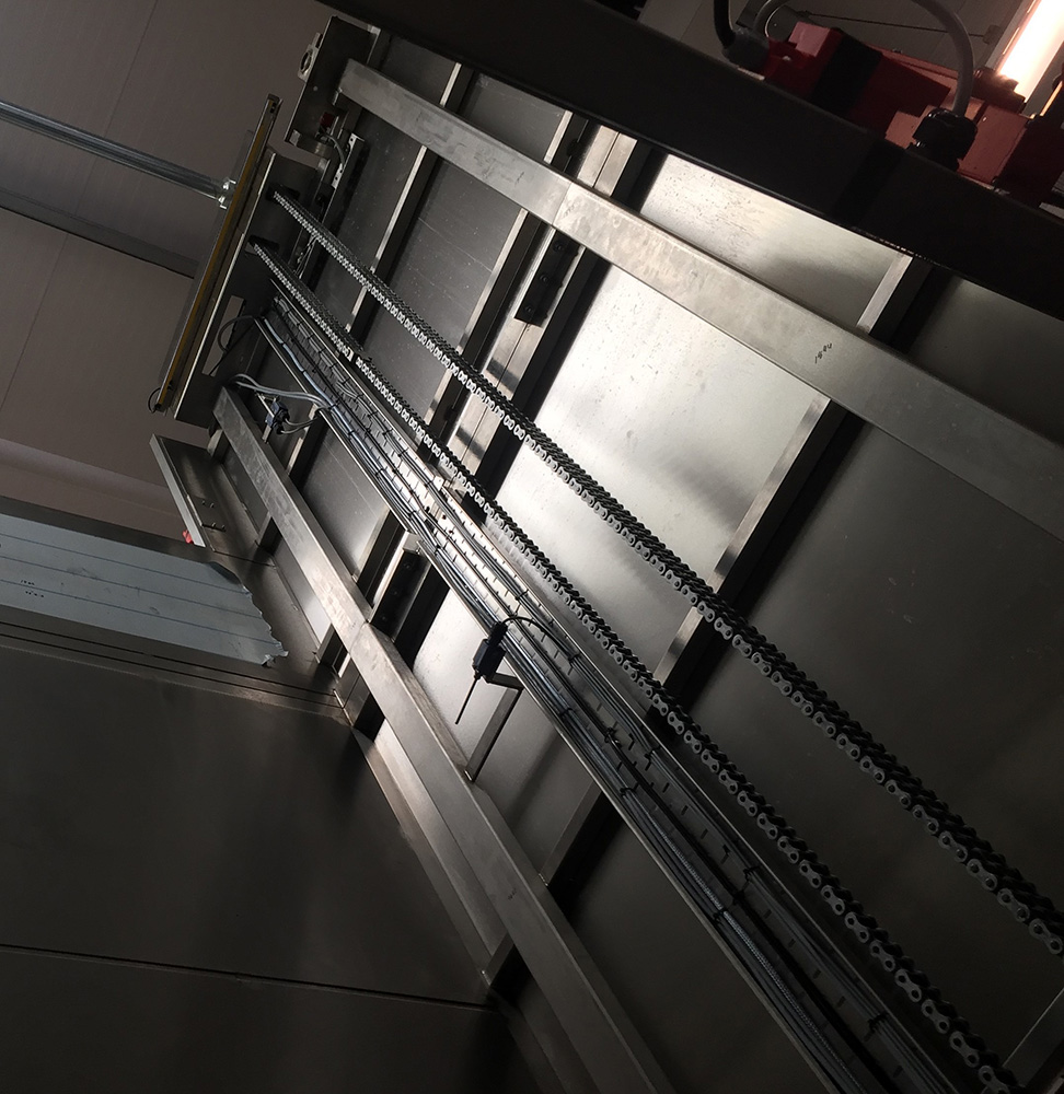 The safety guard is constructed from 40 x 40 x 3mm stainless steel Grade 316 box section and 1.5mm stainless steel Grade 316 sheet to meet the guidelines of BS EN 14120:2015 Safety of Machinery Guards. At the upper level, the handrail over which the bags are unloaded was from box section and 2mm stainless steel sheet. This guard reached to a height of 960mm above the upper floor level, with a pair of hinged doors at the lower level through which the pallet is loaded. Each door is electrically interlocked to prevent the Warehouse Lift being operated with a door open and in addition, the doors are mechanically locked closed whilst the Warehouse Lift is running. Each door may only be opened when the lifting carriage is at the full down position