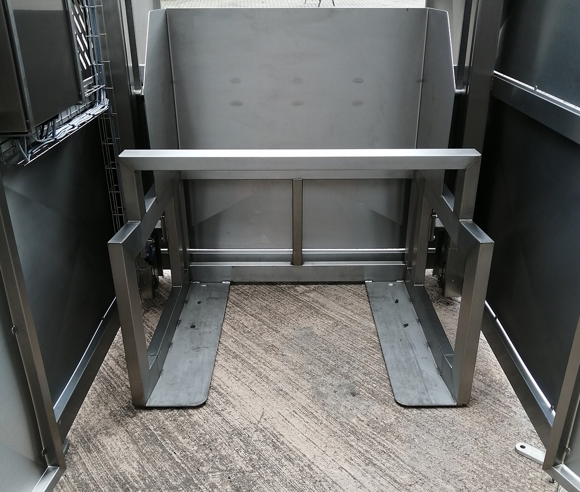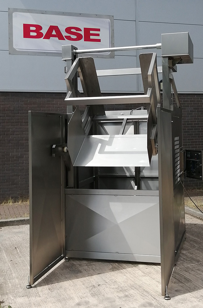 This Double Pillar Box Tipper was supplied complete with a safety guard to meet the guidelines of BS EN 14120:2015 Safety of Machinery Guards. The safety guard is constructed from 40 x 40 x 3mm stainless steel box section and 2.0mm stainless steel sheet. It encloses the Double Pillar Box Tipper to a height of 2200mm on two sides, 1300mm at the tipping position with a hinged guard door on the fourth side. The guard door is electrically and mechanically interlocked preventing the Double Pillar Box Tipper from operating when the door is open. Additionally, the guard door can only be opened when the lift carriage is at the full down position to prevent access whilst a load is raised.