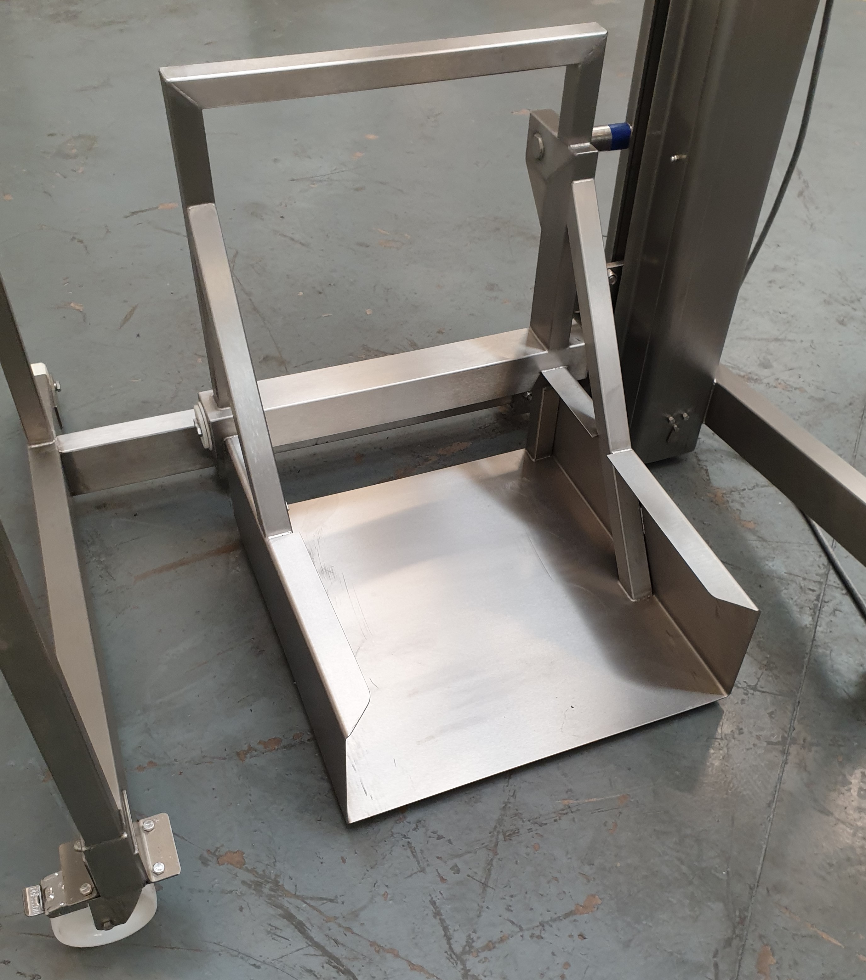 BTM/300/1250/M Wheelie Bin Hoist This Single Pillar Wheelie Bin Hoist is designed to lift and tip a Wheelie Bin at a discharge height of 1250mm. The Wheelie Bin Hoist is manufactured from Grade 304 stainless steel, is a welded construction throughout and is designed to be bolted to the floor. The lifting is achieved by a ¾” Simplex chain driven by a motor gearbox mounted at the top of the main column. The unguarded Wheelie Bin Hoist is fitted with our unique safety latch which engages automatically in the extremely unlikely event of a lift chain failure. Wheelie Bin Hoist Electrical ControlThis Wheelie Bin Hoist is fitted with an IP65 Stainless Steel Control Panel which is mounted on the main column at a convenient position to give good maintenance access under the Provision and Use of Work Equipment Regulation 1998 (PUWER). Upper and Lower end of travel limit switches are positioned to prevent inadvertent adjustment or damage but are easily adjustable by trained personnel for fine adjustment on site. The unguarded Wheelie Bin Hoist operates on a ‘hold to run’ principle such that the ‘Up’ or ‘Down’ pushbuttons must be held for the Wheelie Bin Hoist to operate. As soon as either button is released, the Wheelie Bin Hoist will stop. The control panel has a volt free pair of contacts which can be used to connect a ‘Call to Run’ signal if required.